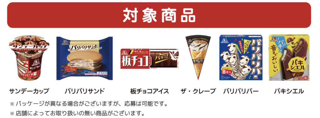 【対象商品】・パキシエル ・パリパリバー ・ザ・クレープ ・板チョコアイス ・サンデーカップ ・パリパリサンド※店舗によっては対象商品のお取り扱いがない、または欠品している場合がございます。予めご了承ください。