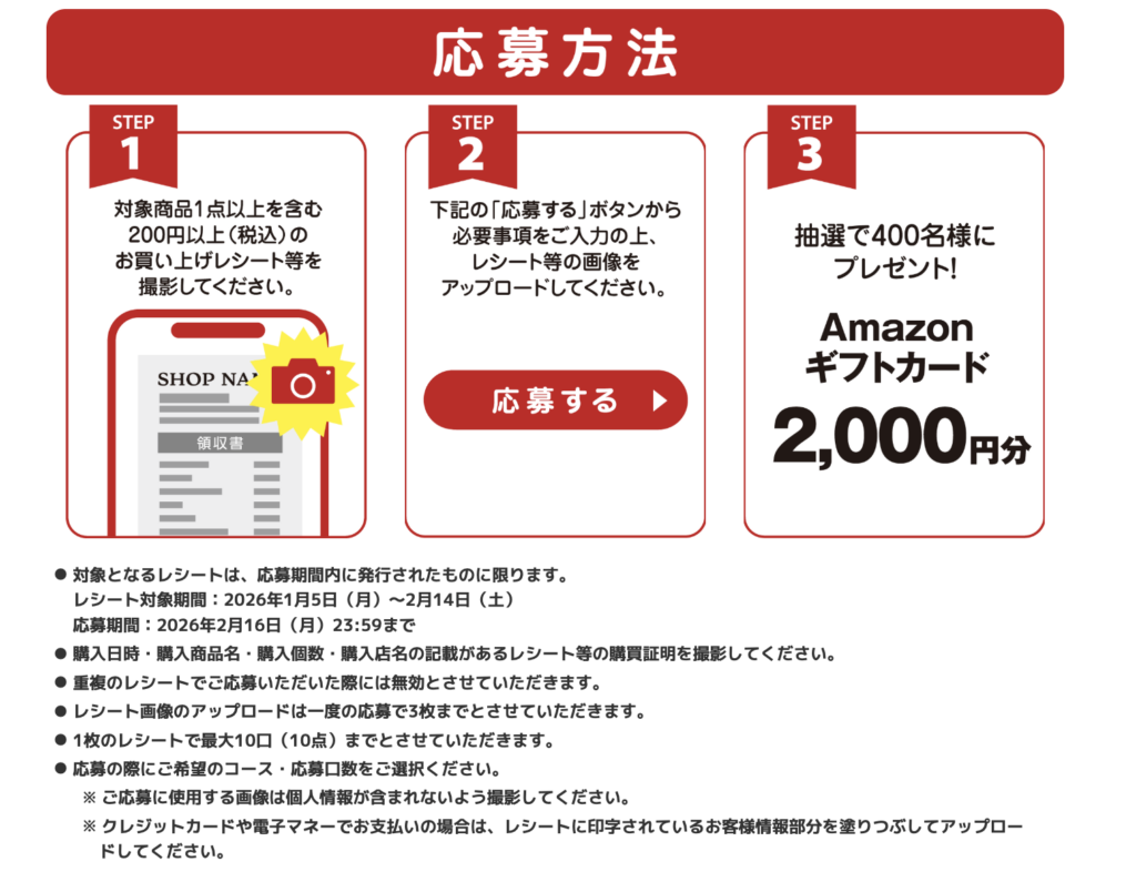 【応募期間】レシート有効期間:2026年1月5日(月)〜2026年2月14日(土)