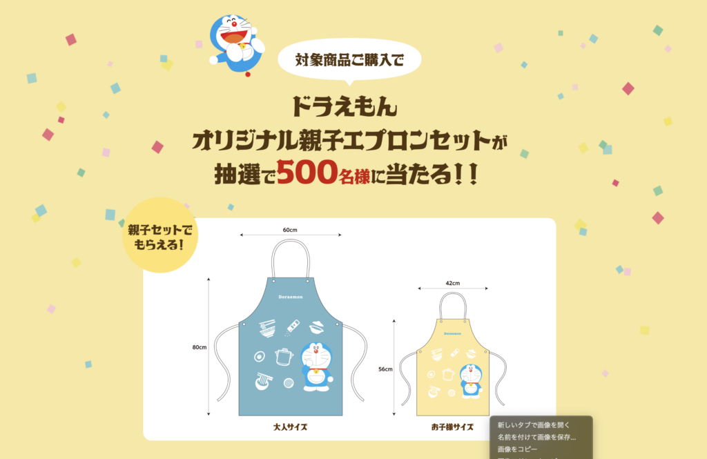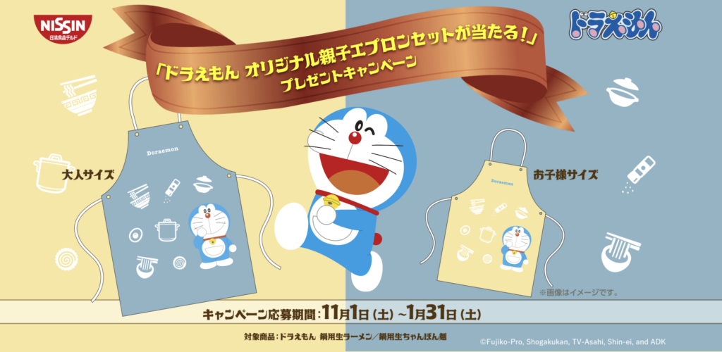 【懸賞】日清 ドラえもん オリジナル親子エプロンセットが当たる!」プレゼントキャンペーン