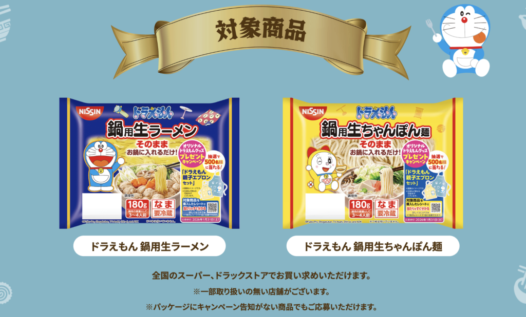 【対象商品】「ドラえもん 鍋用生ラーメン 180g」「ドラえもん 鍋用生ちゃんぽん麺 180g」