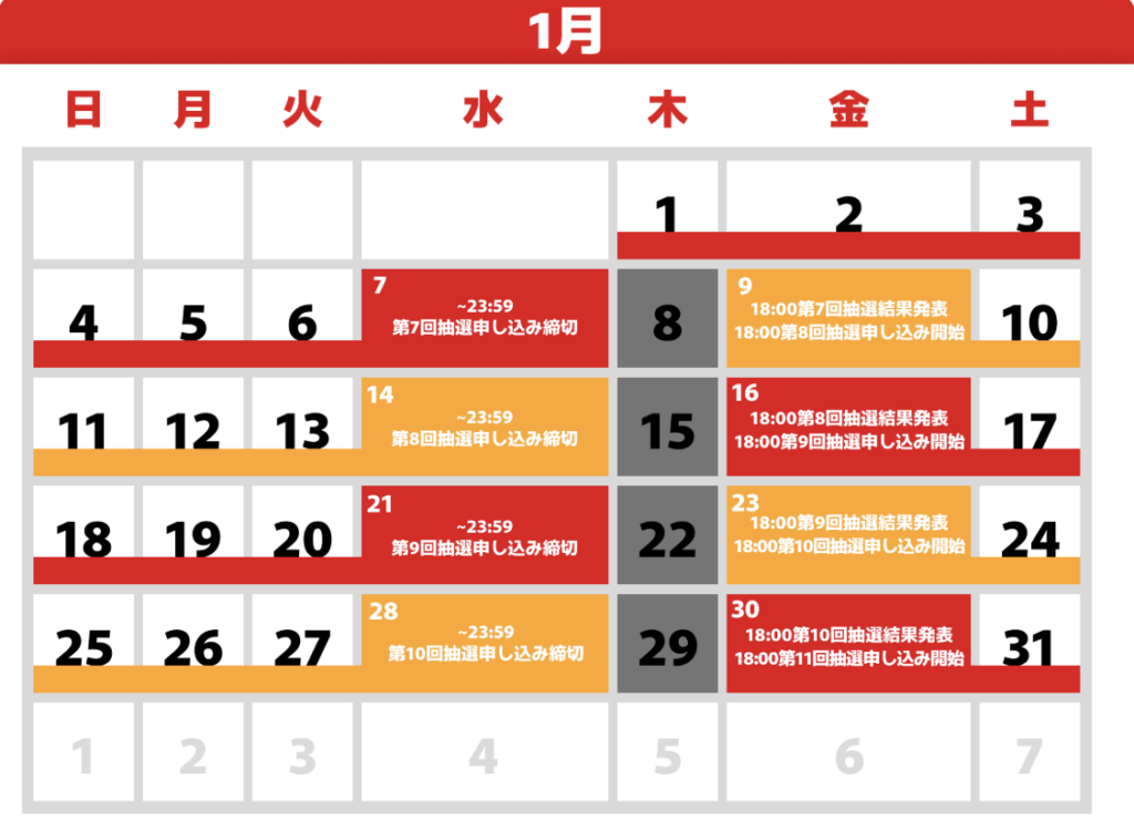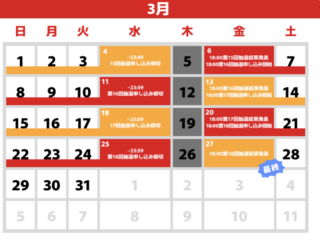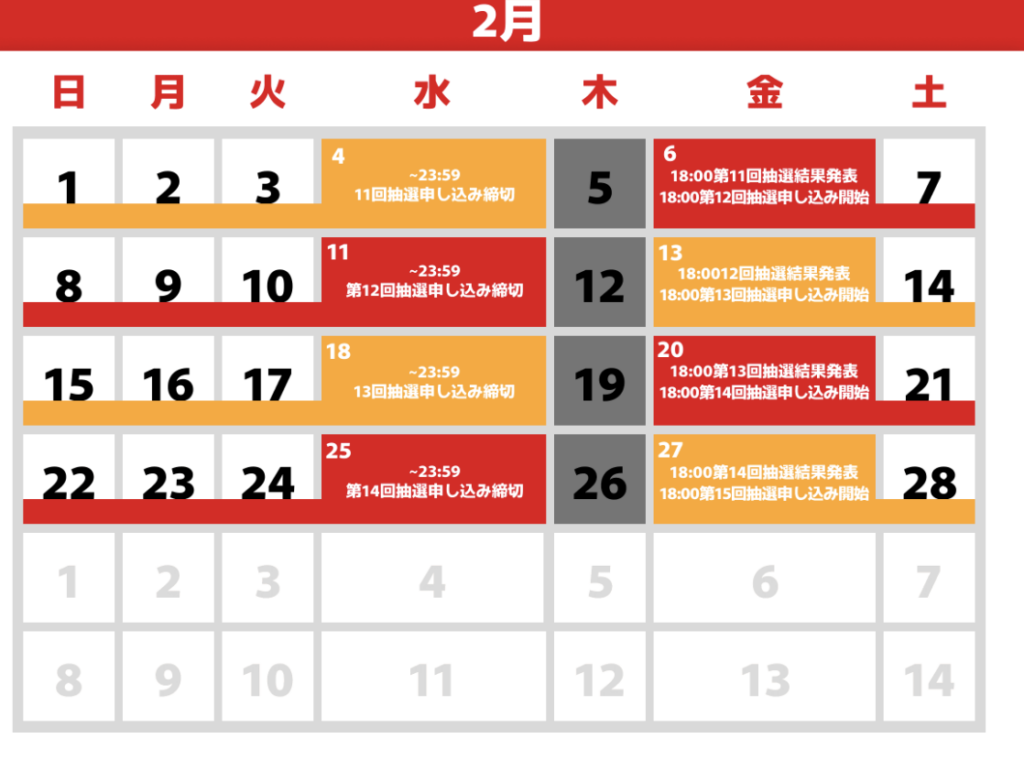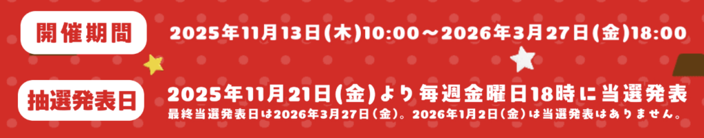【賞品発送】当選発表 ・厳正なる抽選のうえ、毎週金曜日の18時に当選結果がマイページに表示されます。 ・ご応募状況及び当選履歴につきましては、マイページメニューの「抽選履歴」から 期間中いつでも確認可能です。 ・当選ページ内に景品配送先入力フォームのURLを表示いたしますので、 手順に伴いご入力ください。指定の期間内にご入力がない場合は当選を無効と させていただきますのでご注意ください。