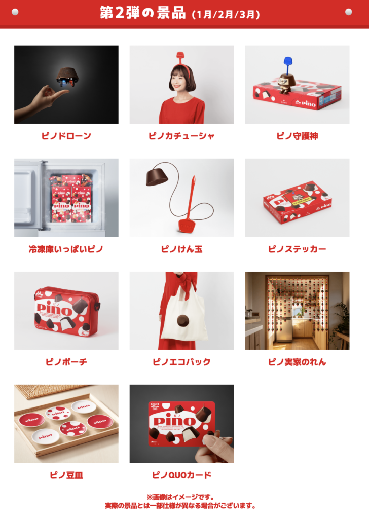 ・第1弾の応募期間の当選の配達時期は、2026年2月下旬頃を予定しており、第2弾の応募期間の当選の配達時期は、2026年4月下旬頃を予定しております。 ・景品の冷凍庫いっぱいピノ(ピノ5箱詰め合わせ)にご当選された場合は、 第1弾:配達日を2026年2月20日(金)、2月21日(土)、2月22日(日)から 第2弾:配達日を2026年4月24日(金)、4月25日(土)、4月26日(日)から それぞれ選択していただく必要がございます。 ※配達日は変更となる可能性があります。変更の場合はキャンペーン事務局 よりメールにてご連絡いたします。
