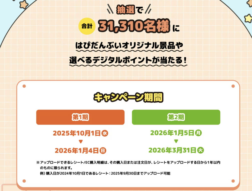 「選べるデジタルポイント」以外のコースに当選された場合は、第1期:2026年1月下旬、第2期:4月下旬を目安に賞品の発送を予定しております。なお、当選者の発表は、賞品の発送をもって代えさせていただきます。